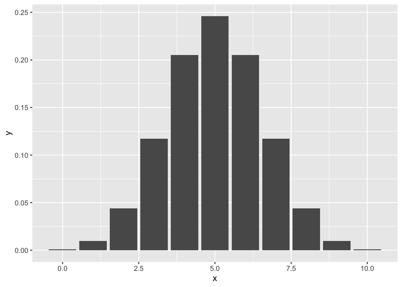For example, we can plug in all the possible values for k in 10 coin tosses into our PMF and visualize what the binomial distribution looks like for all possible values.