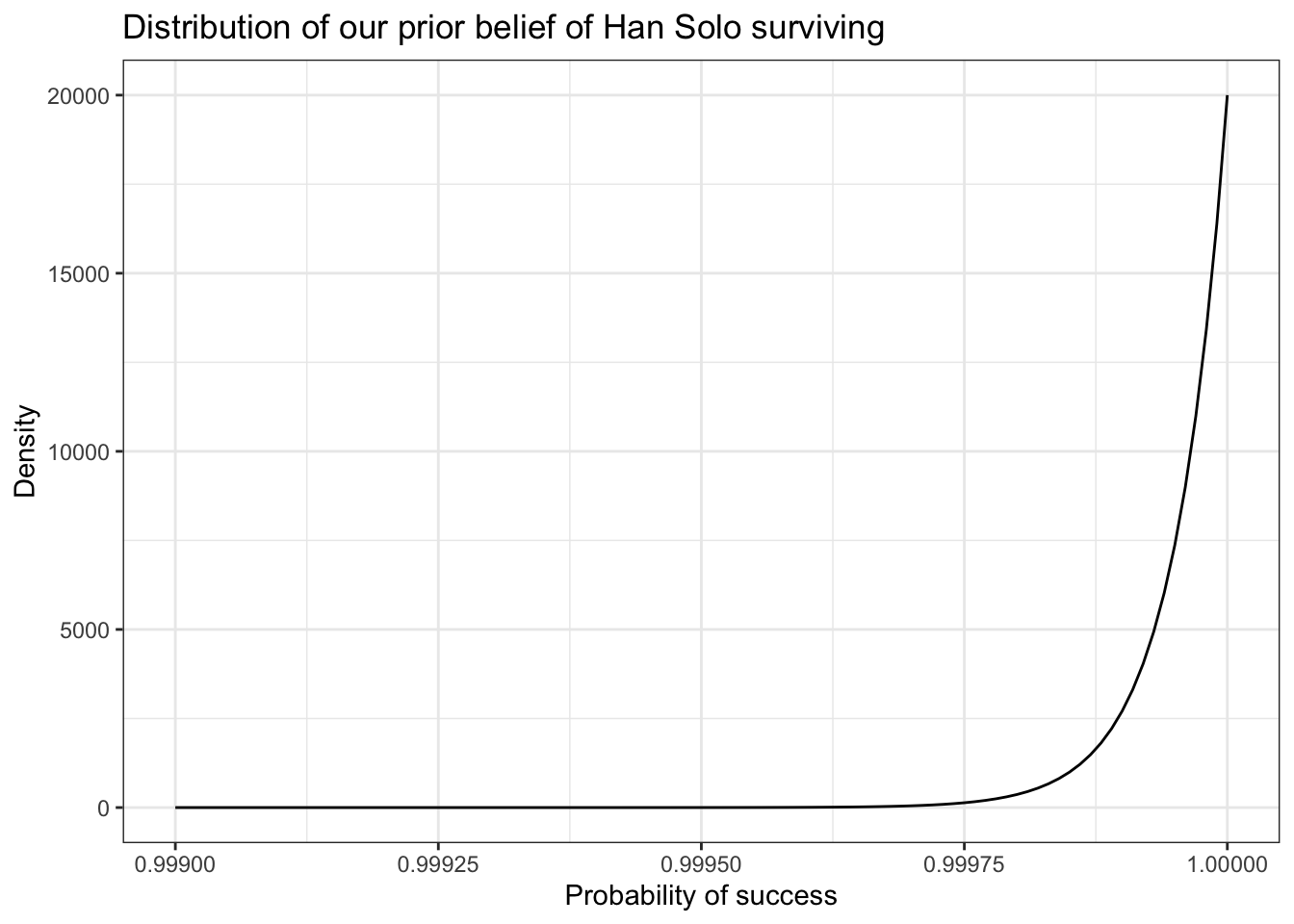 We’ll start with some sort of upper bound on Han’s badassery. If we believed Han absolutely could not die, the movie would become predictable and boring. At the other end, our belief that Han will succeed is stronger than C-3PO’s belief that he won’t, so let’s say that our belief that Han will survive is 20,000 to 1. (81)