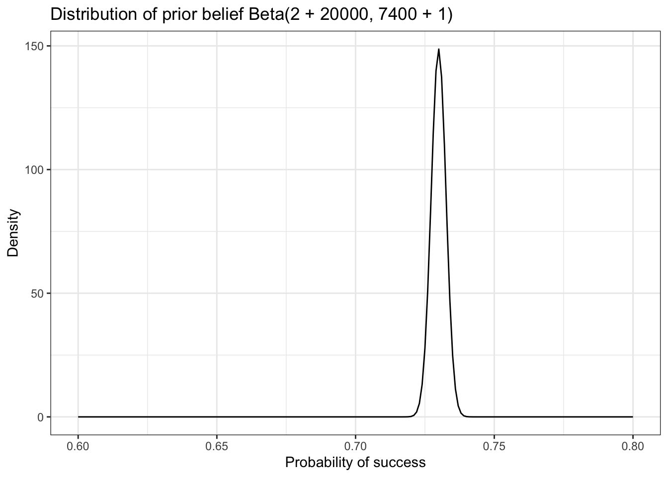 title = "Distribution of prior belief Beta(2 + 20000, 7400 + 1)",