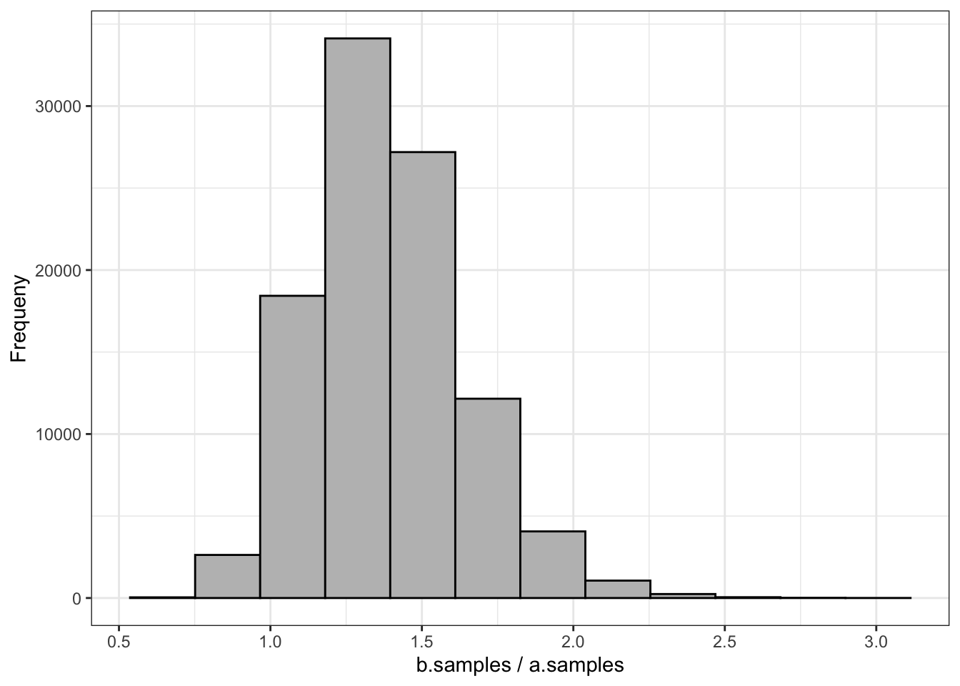 From this histogram we can see that variant B will most likely be about a 40 percent improvement (ratio of 1.4) over A, although there is an entire range of possible values.