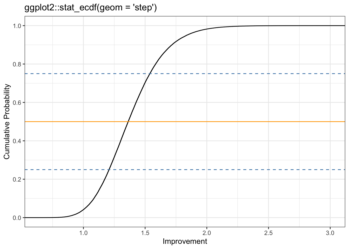 As we discussed in Chapter 13, the cumulative distribution function (CDF) is much more useful than a histogram for reasoning about our results. Since we’re working with data rather than a mathematical function, we’ll compute the empirical cumulative distribution function with R’s ecdf() function. The eCDF is illustrated in Figure 15.4.